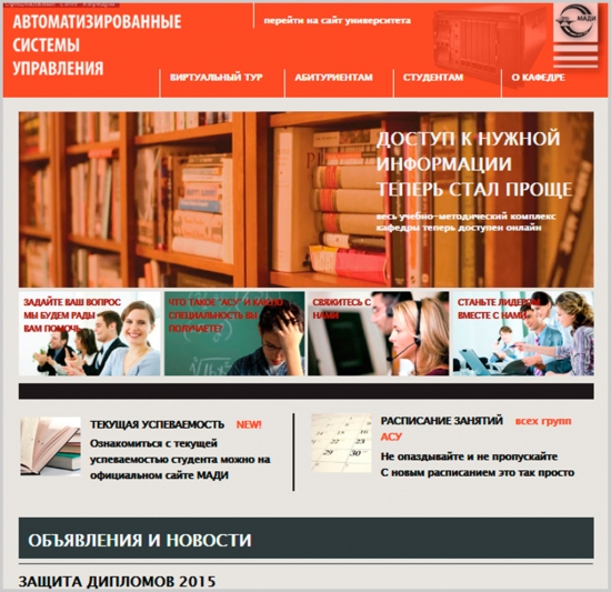Московский автомобильно-дорожный государственный технический университет очень широко известен в своих технических кругах как институт, выпускающий специалистов различных профилей. Нельзя не отметить факультет автоматизированных систем управления, который подготавливает специалистов в области информатизации. Они и создали этот сайт, в помощь самим себе и своим однокашникам. На сайте можно ознакомиться с информацией о специальности АСУ, связаться с администрацией факультета, посмотреть расписание занятий и текущую успеваемость студента. Очень важно чтобы каждый факультет любого вуза создавал о себе такой сайт, где студенты могли бы узнавать новости из своей области, смотреть вакансии, предлагаемые фирмами. А может даже и просто общаться со своими единомышленниками, ведь учеба в институте — это не просто получение информации, студент развивается как личность, находит друзей, обзаводится нужными связями. Сайт позволит объединить всех людей так или иначе связанных с факультетом. |