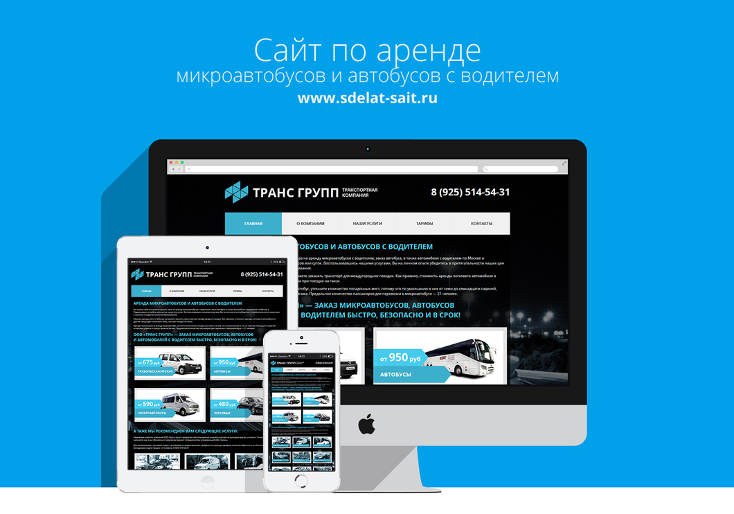 Сайт создан для фирмы занимающейся перевозкой людей. Очень удобный сервис аренды автомобилей, приятные цены. В зависимость он количества человек вы сможете выбрать именно тот транспорт, который вам подходит, не переплачивая за лишние места. В ассортименте автобусы, микроавтобусы, легковые и грузовые автомобили.